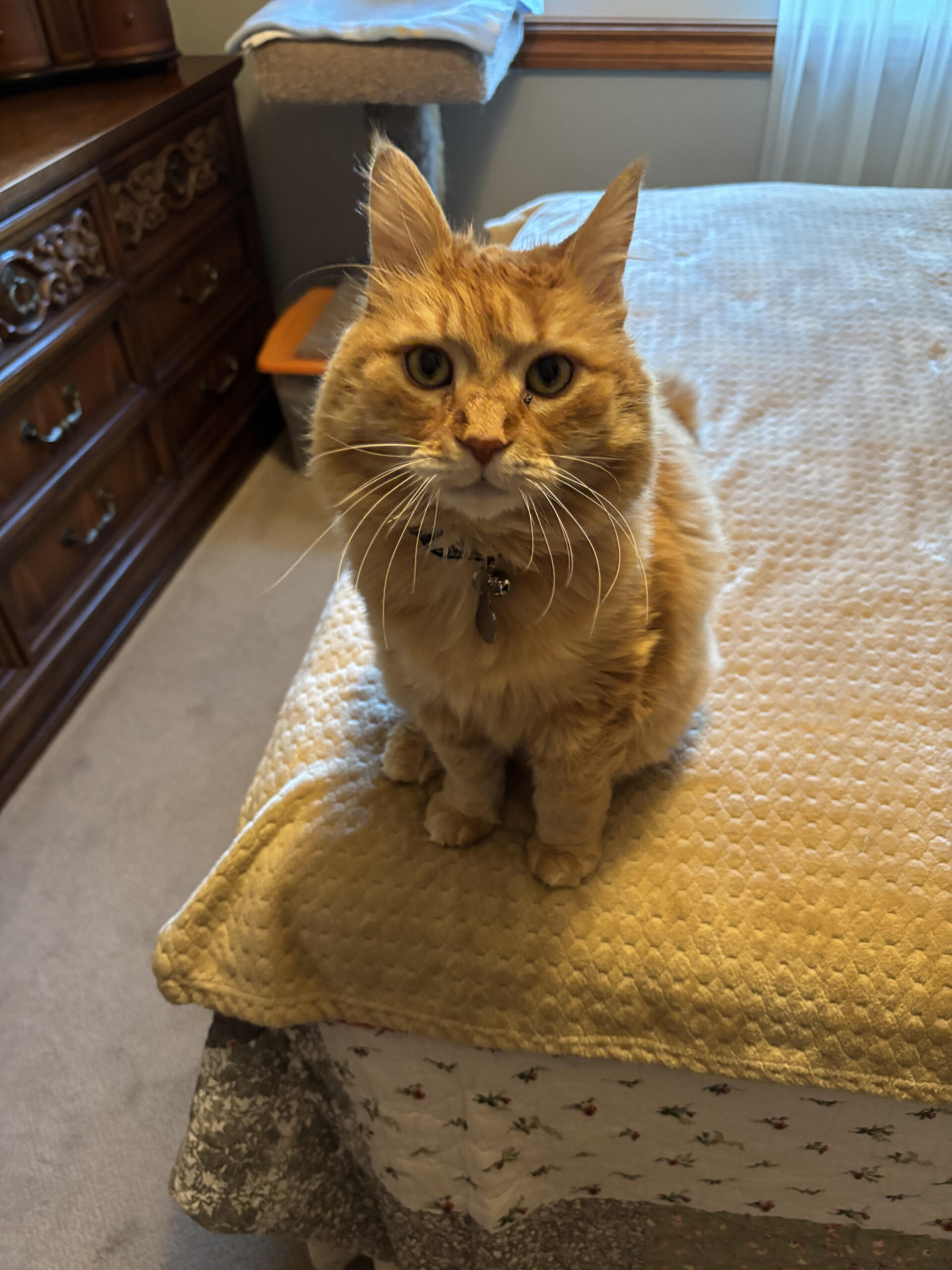 Cat sitting on the edge of a bed in a bedroom, looking up at the camera.