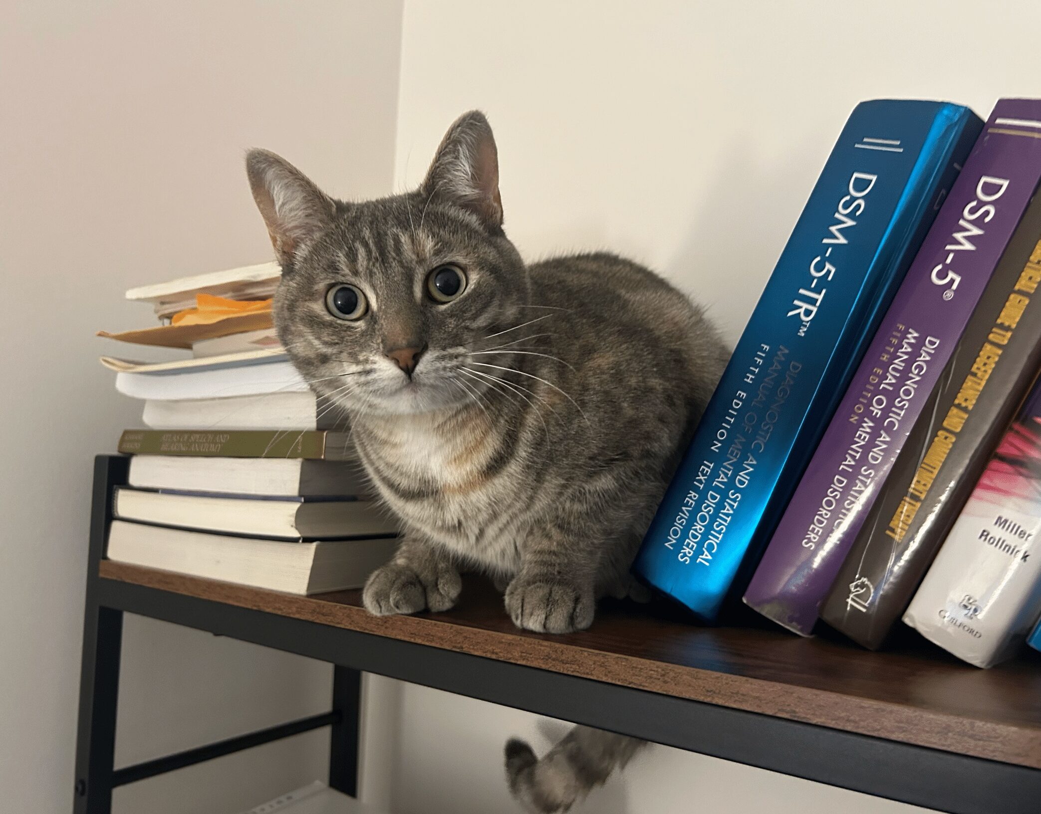 Small orange cat on a decorative blanket with a bookshelf full of books in the background.
