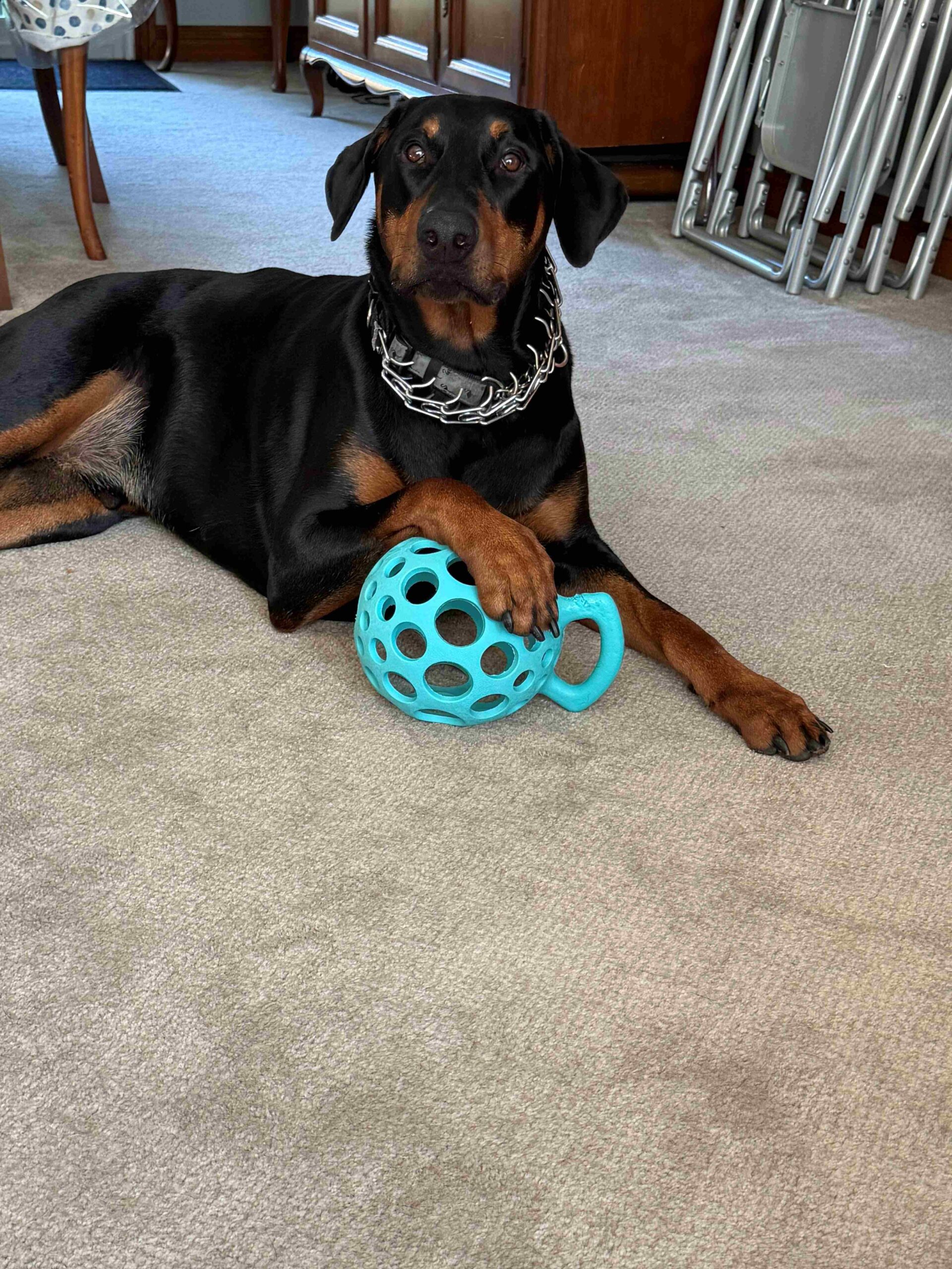 Black and brown dog laying on the ground with a blue ball toy under one paw.