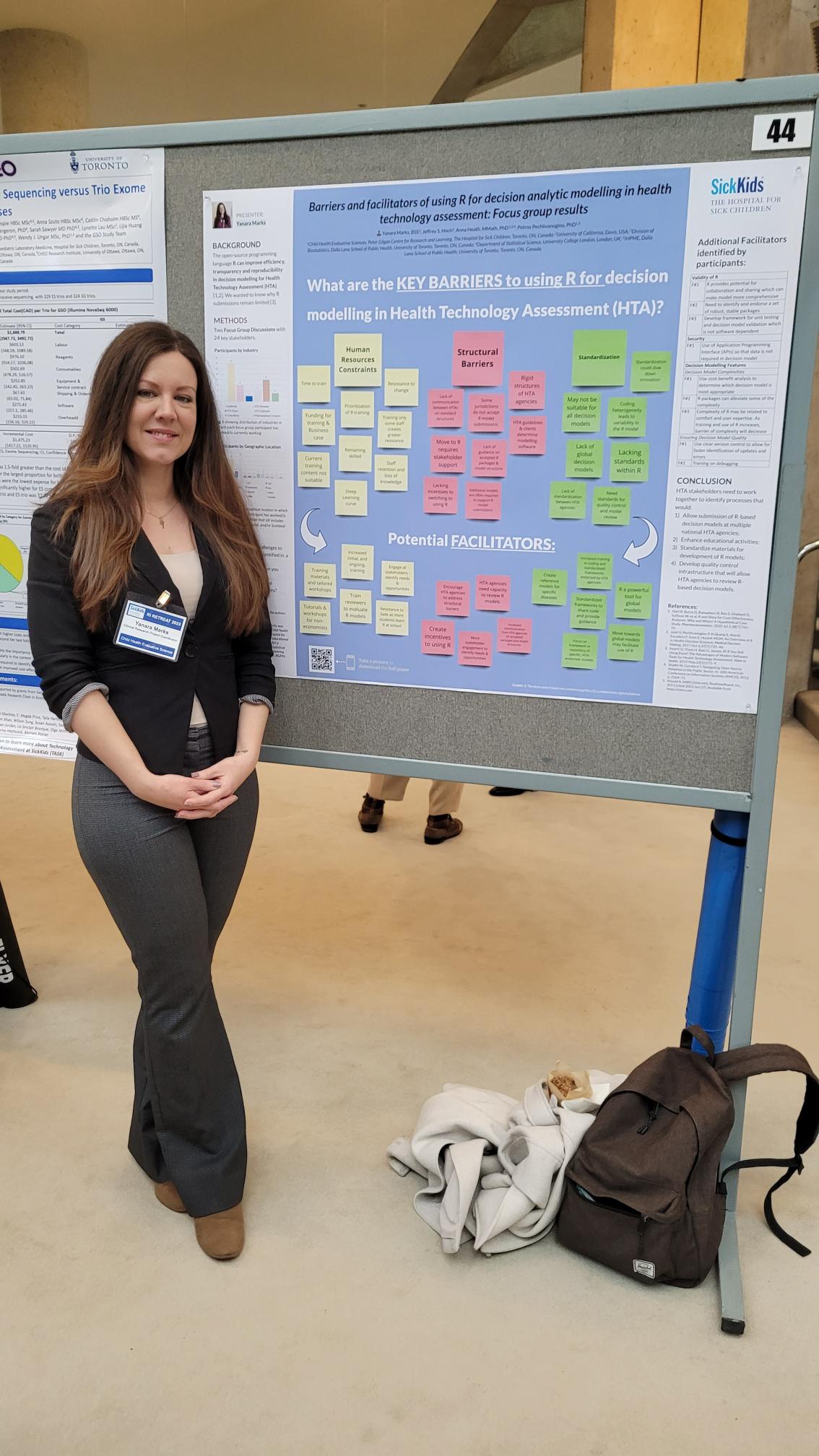 Research coordinator, Yanara Marks (top middle), in front of her poster entitled “Barriers and facilitators to using R for Health Technology Assessment: Focus Group Results”.