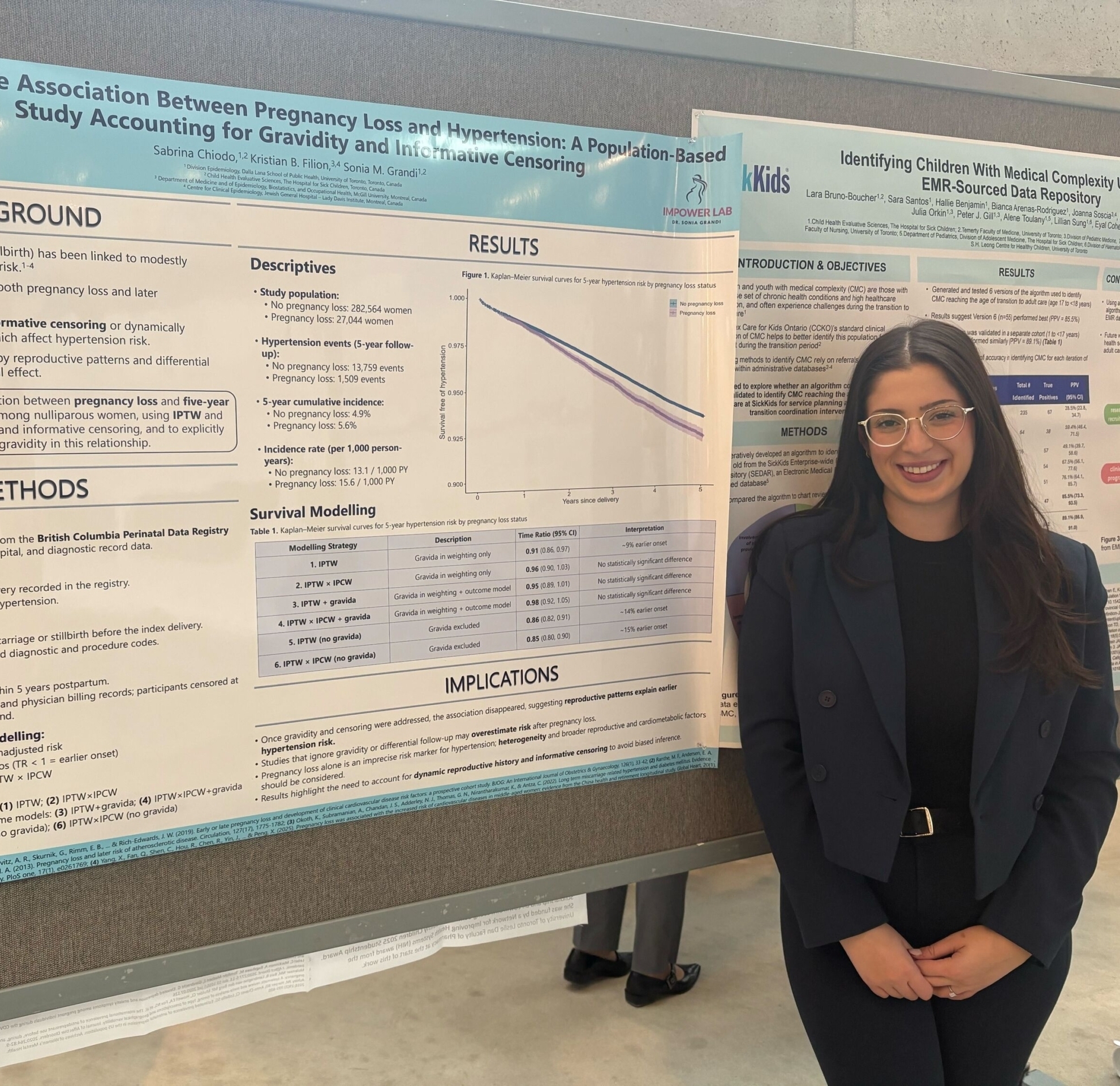 SickKids Principal Investigator (PI), Dr. Sonia Grandi with PhD candidate Sabrina Chiodo (top left), in front of their poster entitled “Methodological considerations for the design of target trials to estimate the safety and effectiveness of medications used in pregnancy”.