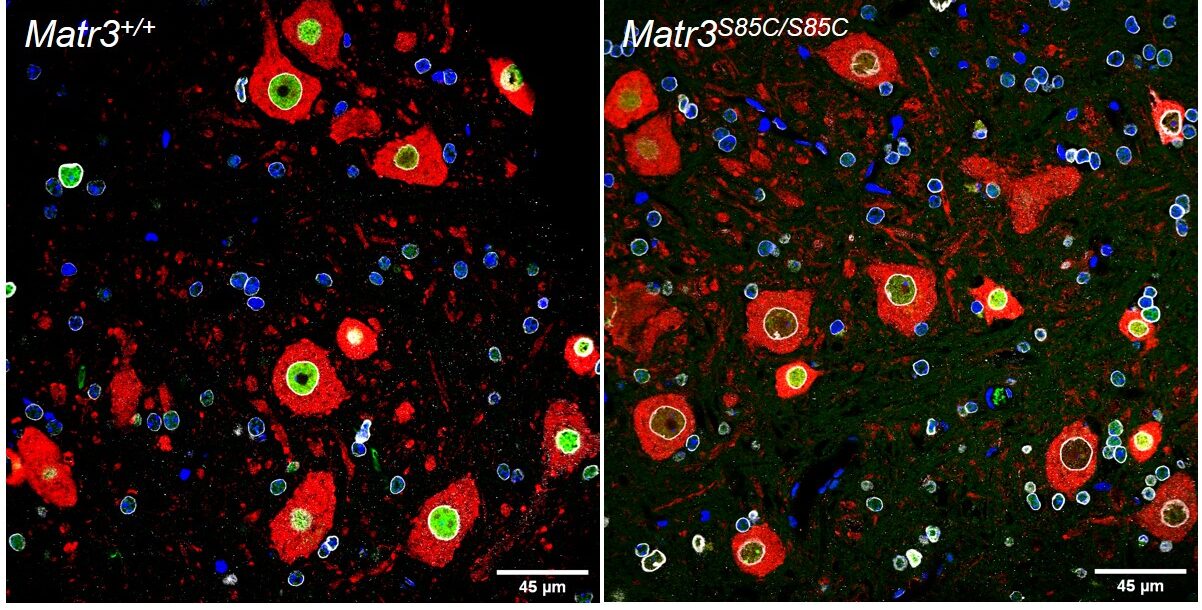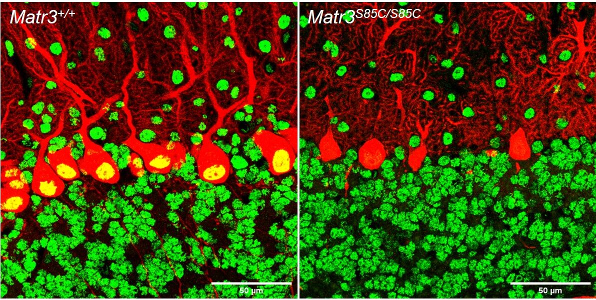 Mouse models have been a powerful tool for studying the molecular mechanism of neurodegenerative diseases as they can recapitulate many aspects of the diseases. Our lab created a new ALS mouse model, which recapitulates early stage features of human ALS including motor deficits, motor neuron defects and neuroinflammation (Kao et al. Nature Communications 2020). This mutant mouse line (MATR3 S85C knock-in mice) harbors a single ALS-linked missense mutation S85C in mouse Matr3 locus, closely mimicking the human genotype. In addition to recapitulating early aspects of ALS including motor neuron (neuromuscular junction) defects, MATR3 S85C knock-in mice exhibit severe loss of Purkinje cells. We also found a dramatic nuclear loss of MATR3 S85C in the neurons that undergo degeneration such as Purkinje cells and motor neurons, but not in neighboring cells. These results implicate that loss of MATR3 function contributes to neuronal defects and that the mutation impacts selective neuronal groups.